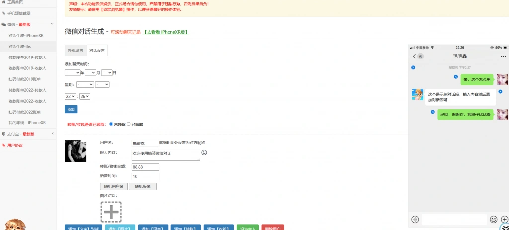 • 微信和支付宝截图生成工具,支持聊天记录、收付款账单、扫码付款、零钱、余额、商品付款等
